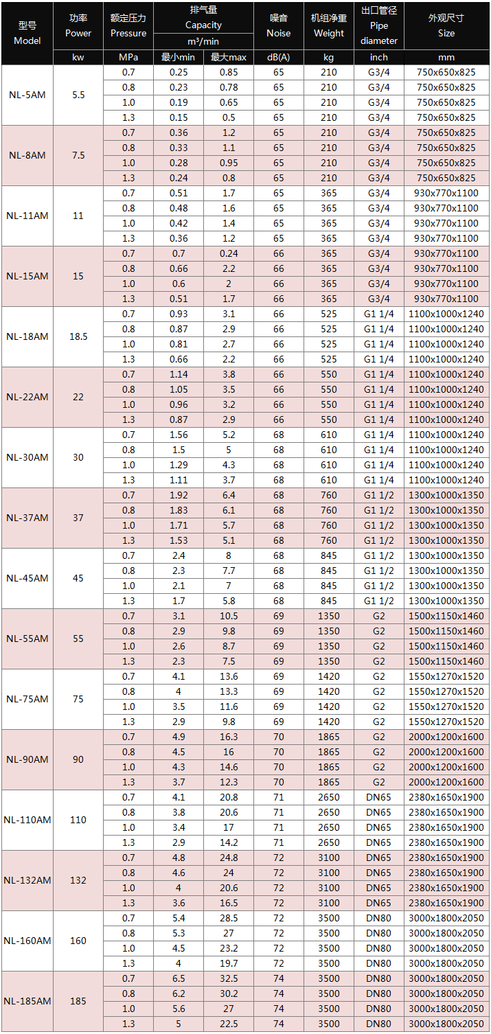 型号: 【NL-AM永磁变频系列】 功率:5.5~132 KW排气量: 0.44~24.1 M³/min排气压力: 0.75~1.30 Map
