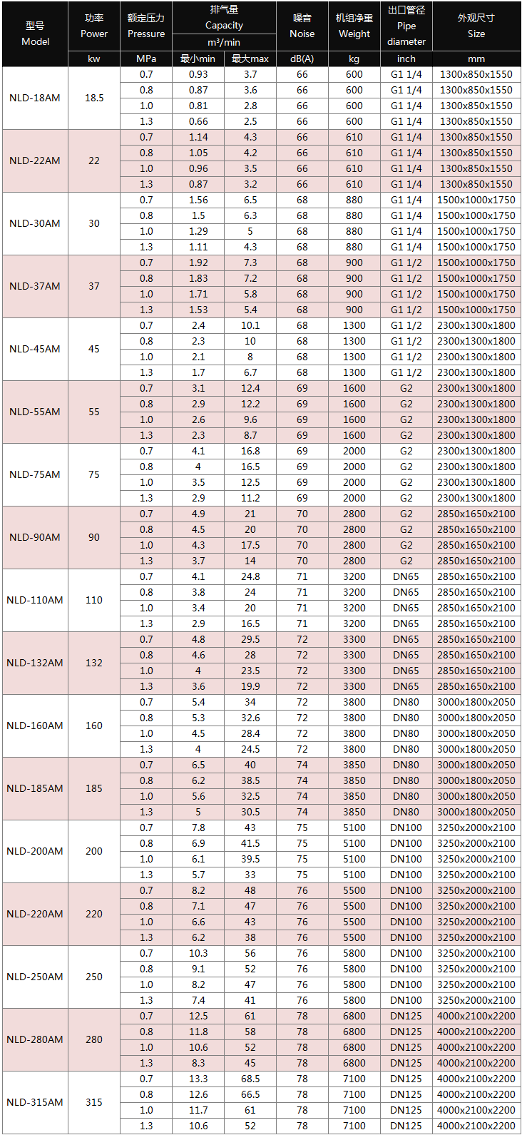 型号: 【NLD-AM二级压缩变频系列】 功率: 45~200 KW 排气量: 2.10~43.80 M/min 排气压力: 0.75~1.30 Map Model 排气压力(Mpa) 电机功率(kW) 噪音(dB) 空气出口管径(inch) 机组净重(Kg) 外形尺寸 0.