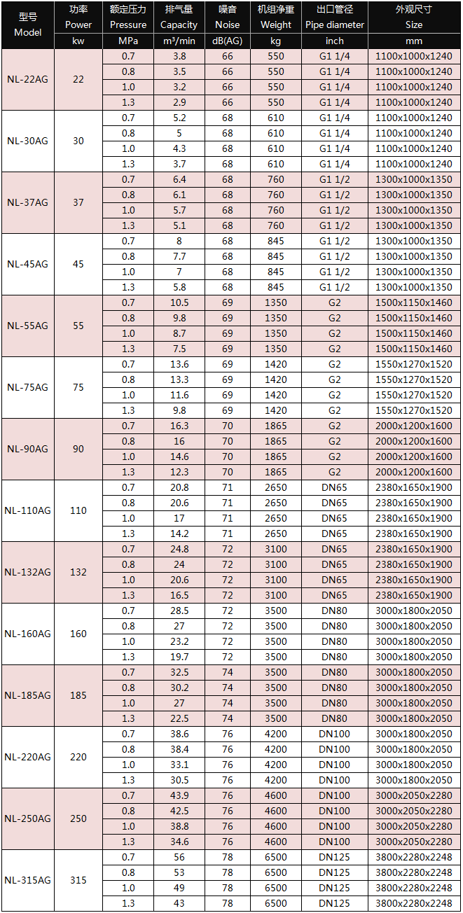 型号: NL-AG直连系列 功率:18.5~315.0 KW 排气量: 1.10~59.8 M/min 排气压力: 0.75~1.30 Map 空压机型号 排气压力(Mpa) 电机功率(Kw) 噪音(dB) 空气出口管径(inch) 机组净重(Kg) 外形尺寸 0.75 0.85